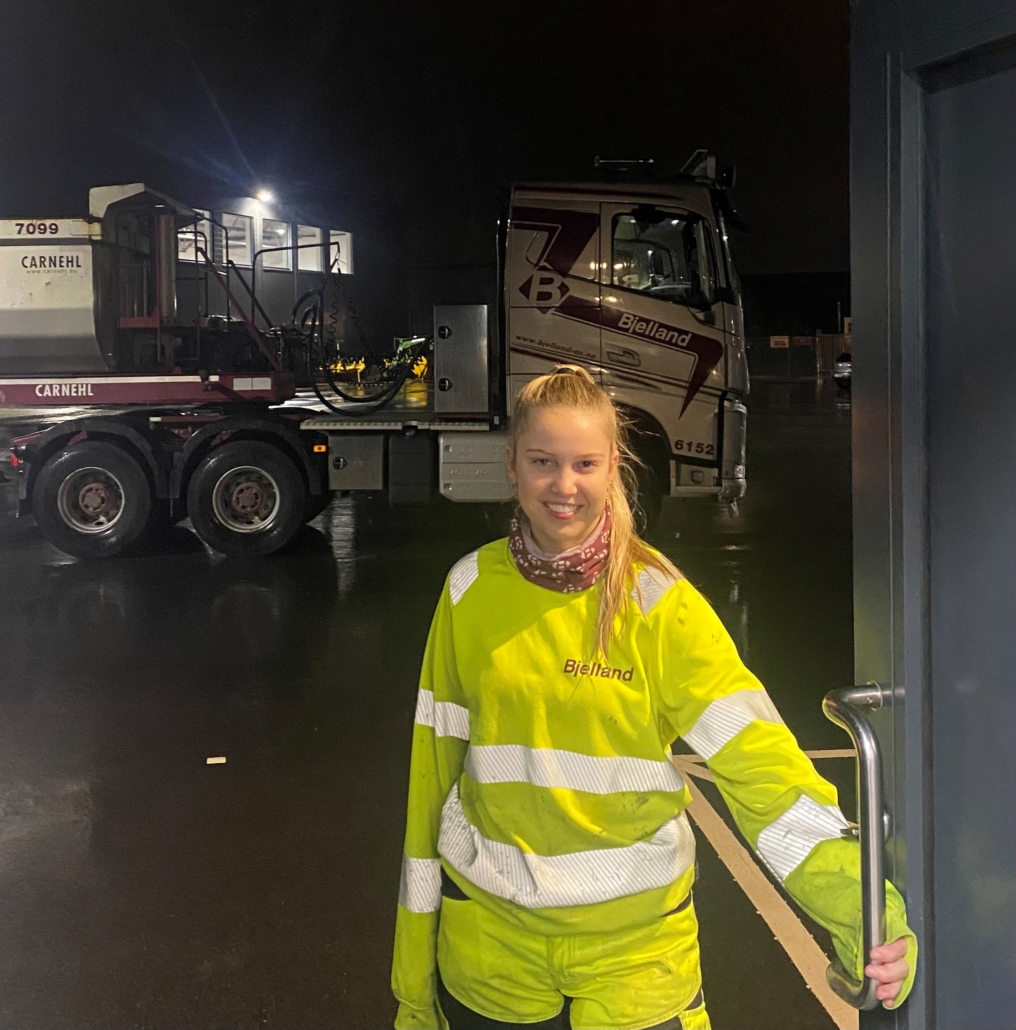 Yrkessjåfør lærling Cecilie på vei ut døren og klar for første dag på veien.